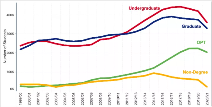 最新的数据显示,在 2020-21 学年美国的国际生人数为 914,095 人(包括在读生和 OPT 阶段学生)。与上一年度相比,国际生人数减少了 15%。